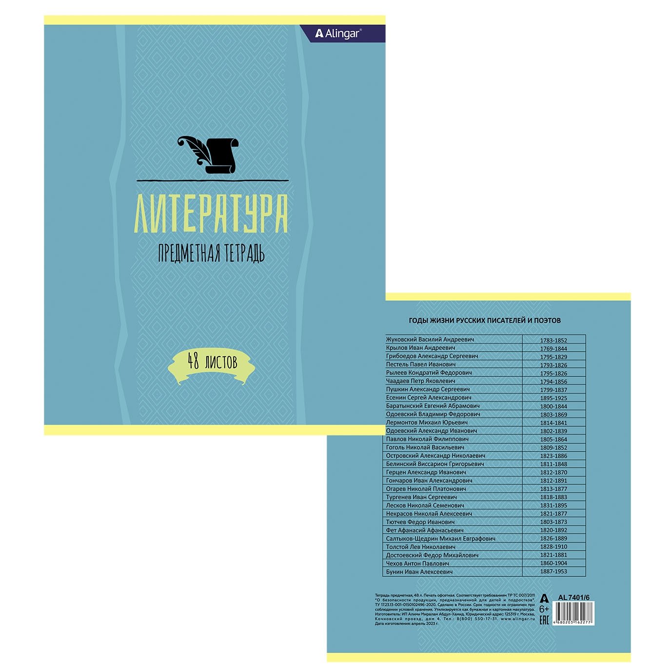 Тетрадь предметная "Литература" А5 48л., со справочным материалом, скрепка, мелованный картон (стандарт), блок офсет, Alingar "Простое решение"
