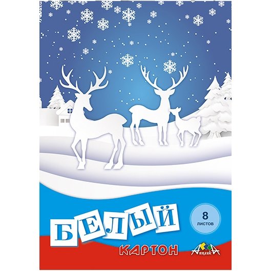 Картон белый Апплика, А4, 8 листов, немелованный, картонная папка, "Белые олени"