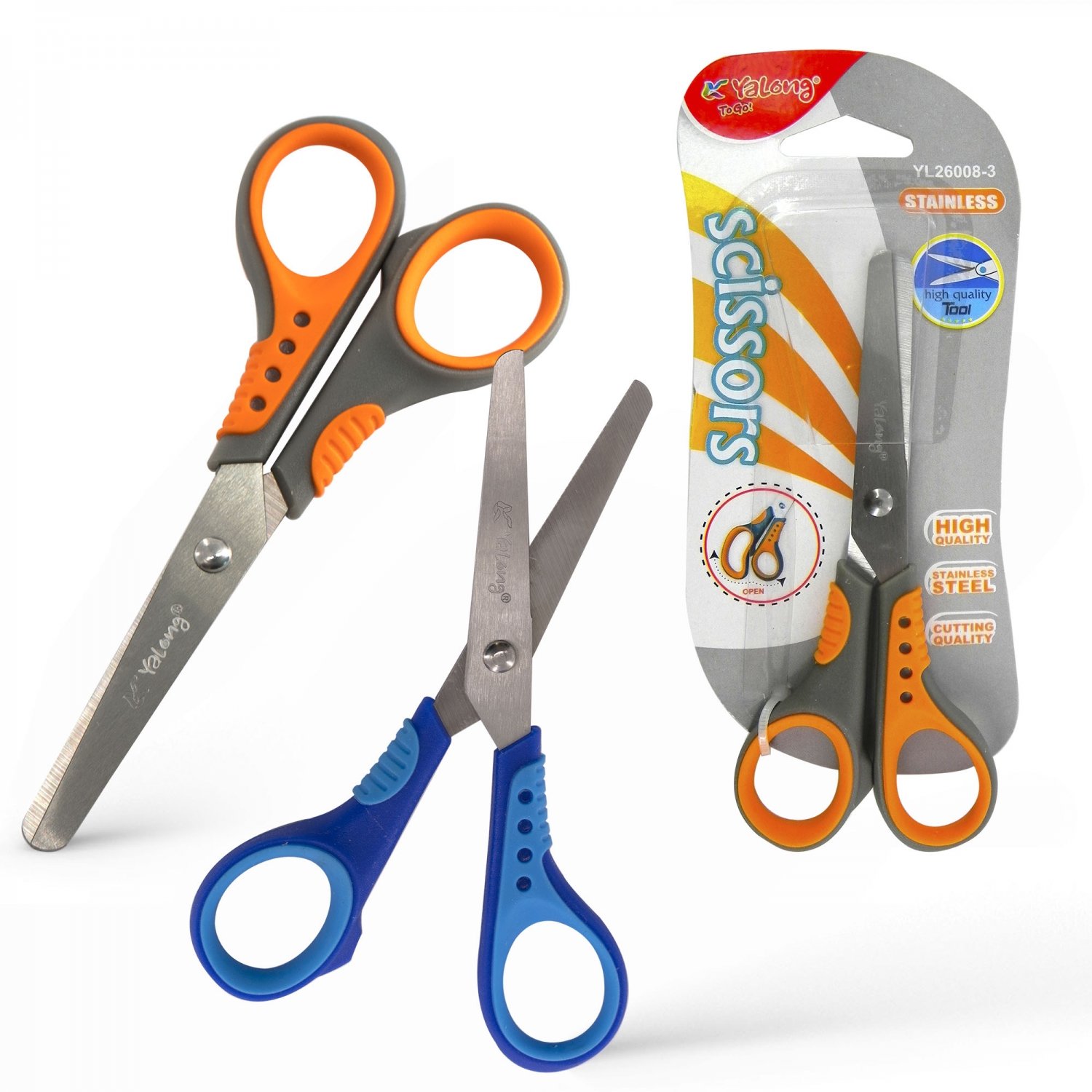 Ножницы канцелярские, Yalong, 13 см., "Эргономик", серо-оранжевые, прорезиненные ручки, европодвес