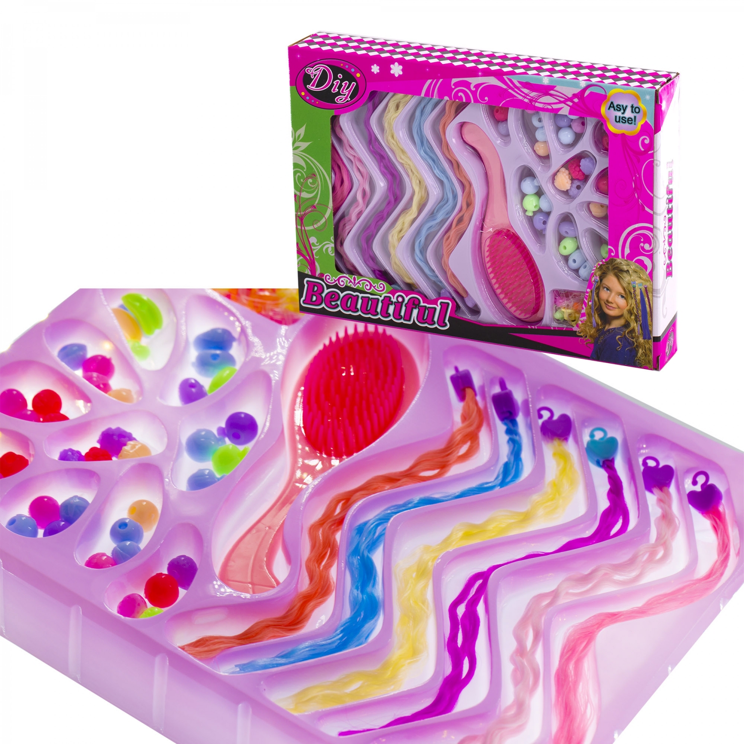 Набор для создания украшений-бусины Alingar, 280х200х45, "Beautiful", 10 вид. бус, пряди, расческа, резин. для волос, крючок, карт. уп.