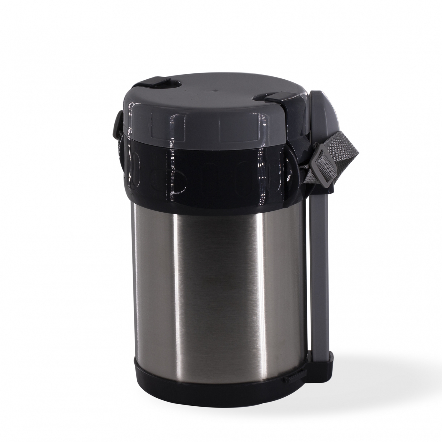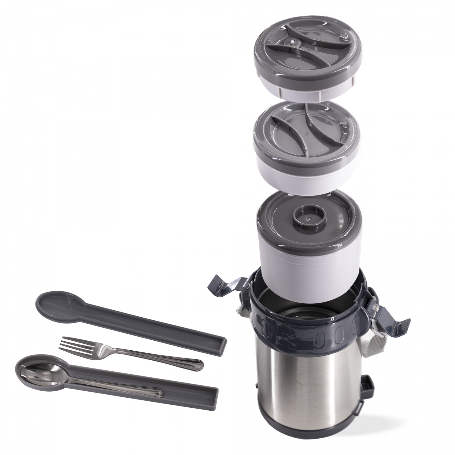 Термос для еды Alingar, объем 2 л., серый, высота 22 см, диаметр 12,5 см, корпус металл/пластик, 3 контейнера, с приборами, ремешок, картон. упаковка