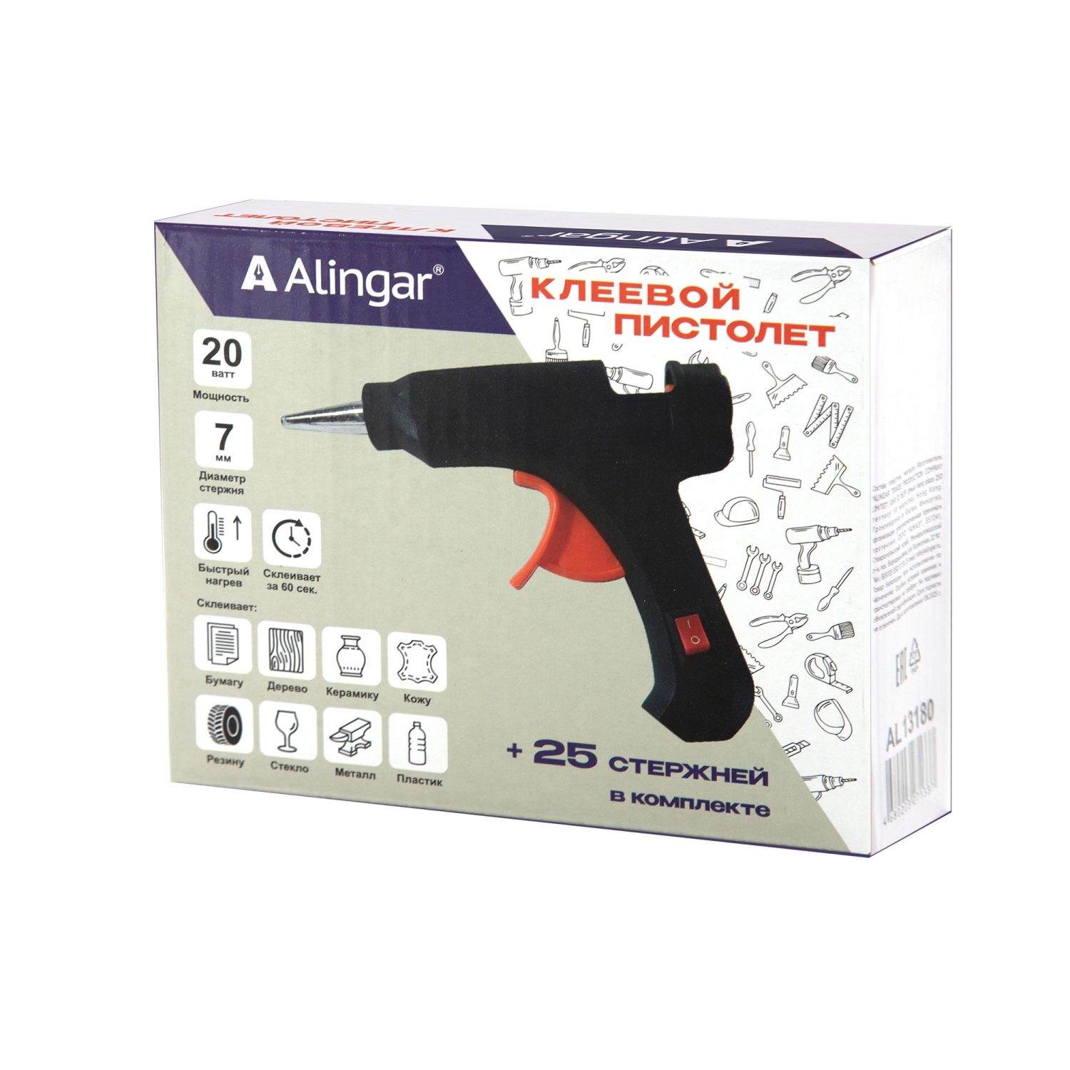 Клеевой пистолет Alingar, 20 Вт,черный, 25 стержней в комплекте, пластиковый корпус, метал.подставка, кнопка питания, индикатор сети