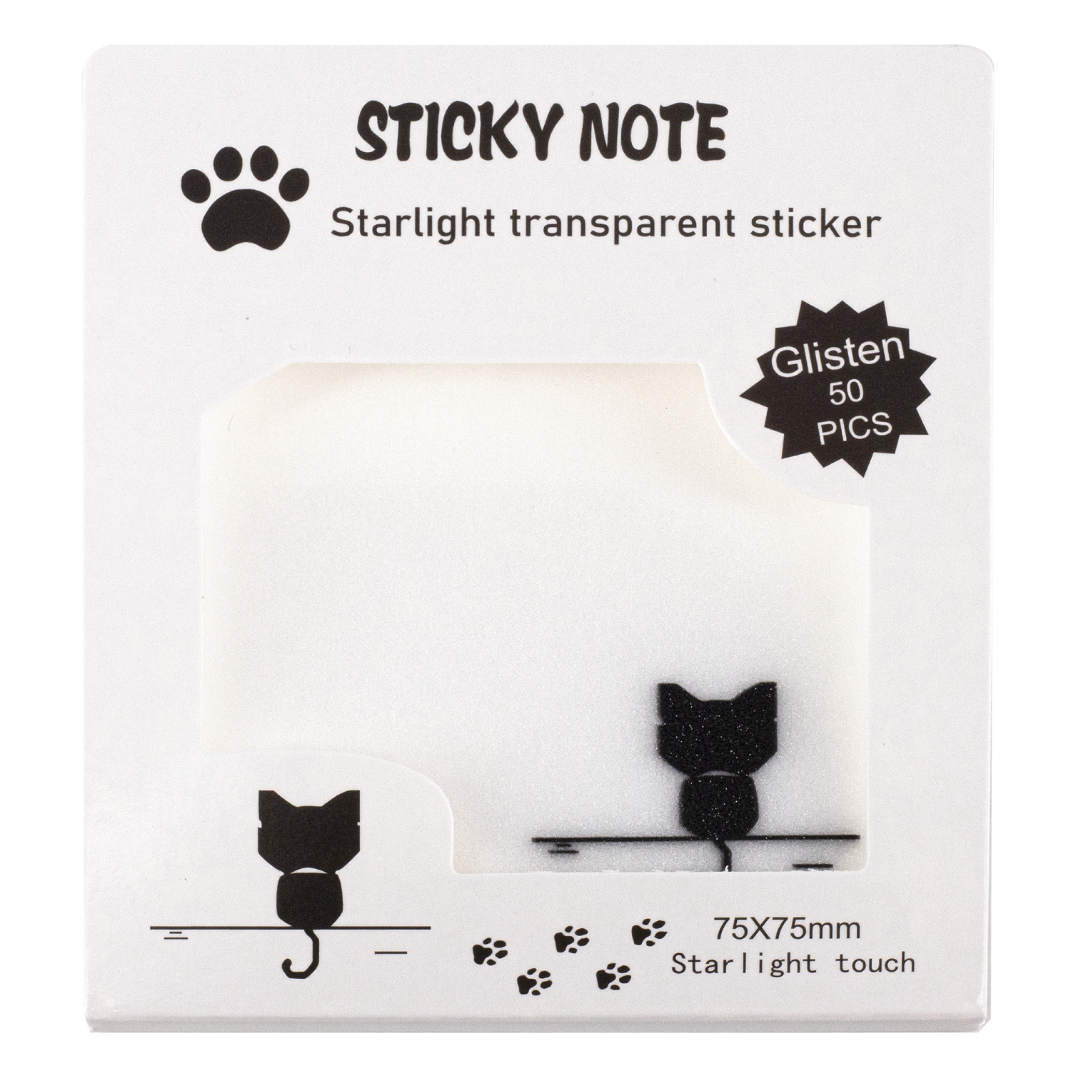 Прозрачные стикеры для заметок с клеевым краем, Alingar, 75 х 75 мм, 50 л., покрытие starlight touch, "Black KITTEN", белый, водонепрониц., европодвес