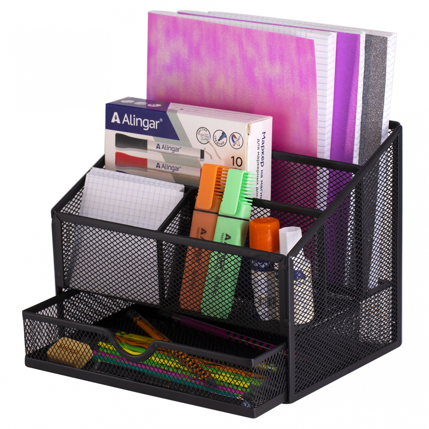 Подставка-органайзер д/канцтоваров, Alingar, металлическая, 23*20*15 см, 5 отделений, выдвижной ящик
