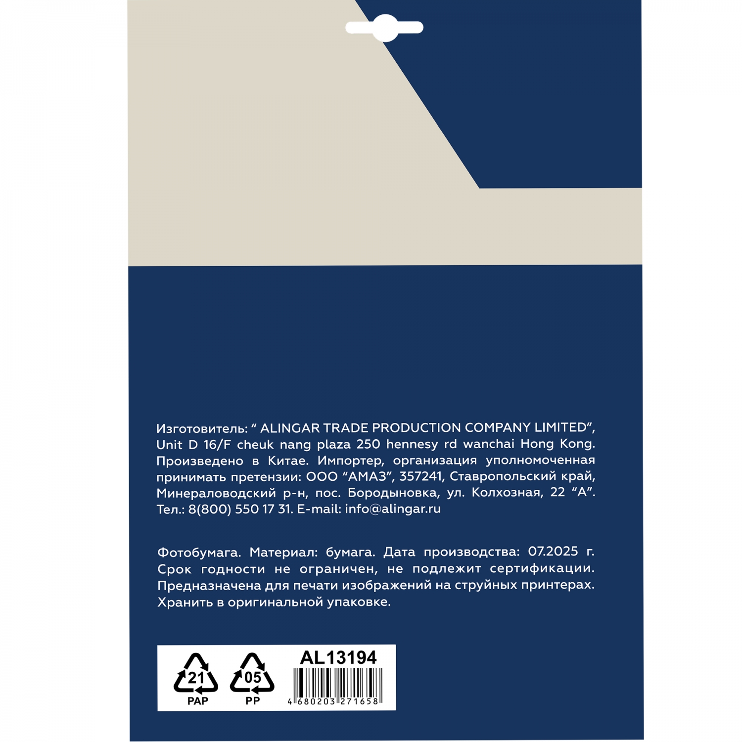 Фотобумага самоклеящаяся Alingar, А4, 50 л., глянцевая, 135 г/м2
