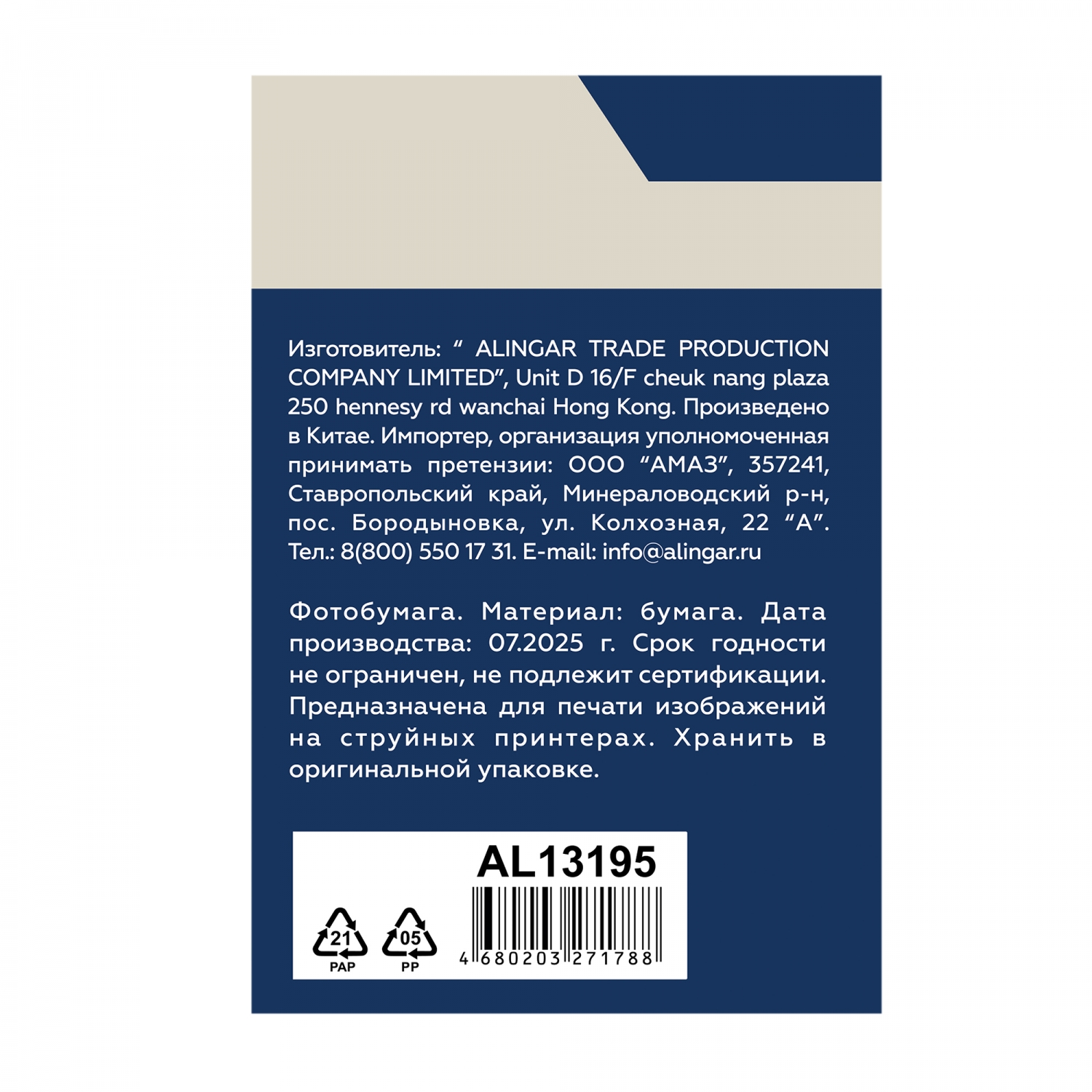 Фотобумага односторонняя Alingar, 10*15 см, 100 л., глянцевая, водостойкая 260 г/м2,