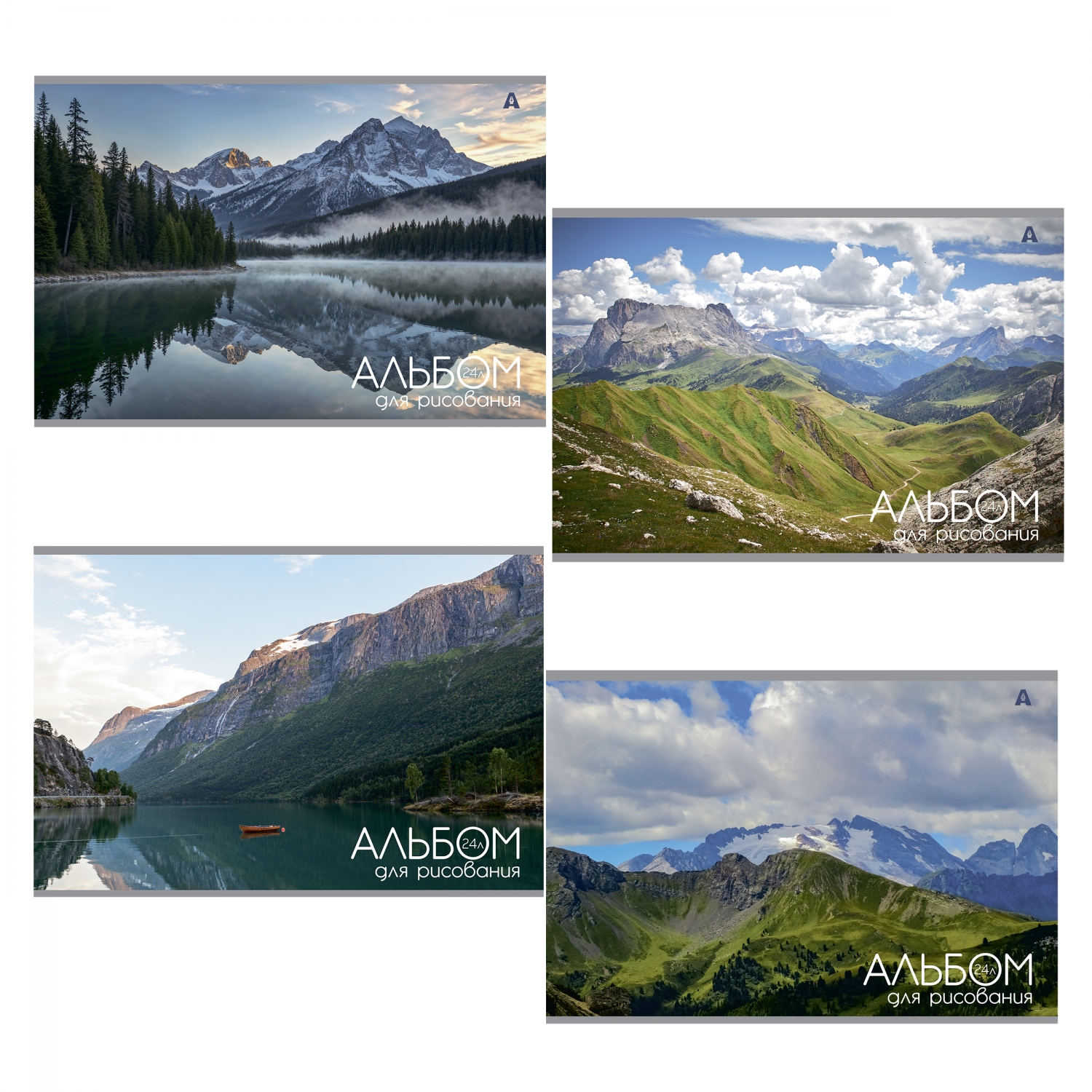 Альбом для рисования А4 24л., Alingar, на скрепке, мелованный картон (стандарт) 210г/м2, офсет 100 г/м2, "Горы", 4 дизайна в пленке т/у