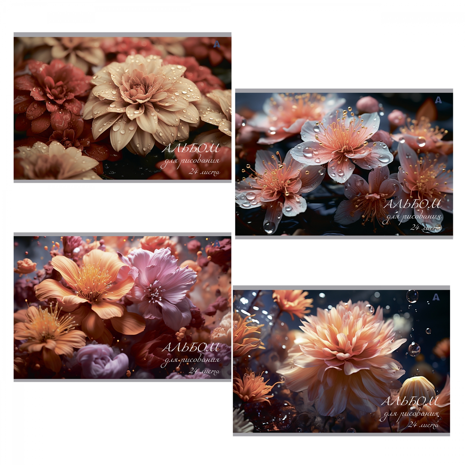 Альбом для рисования А4 24л., Alingar, на скрепке, мелованный картон (стандарт), 100 г/м2, "Нежные цветы. MIX...
