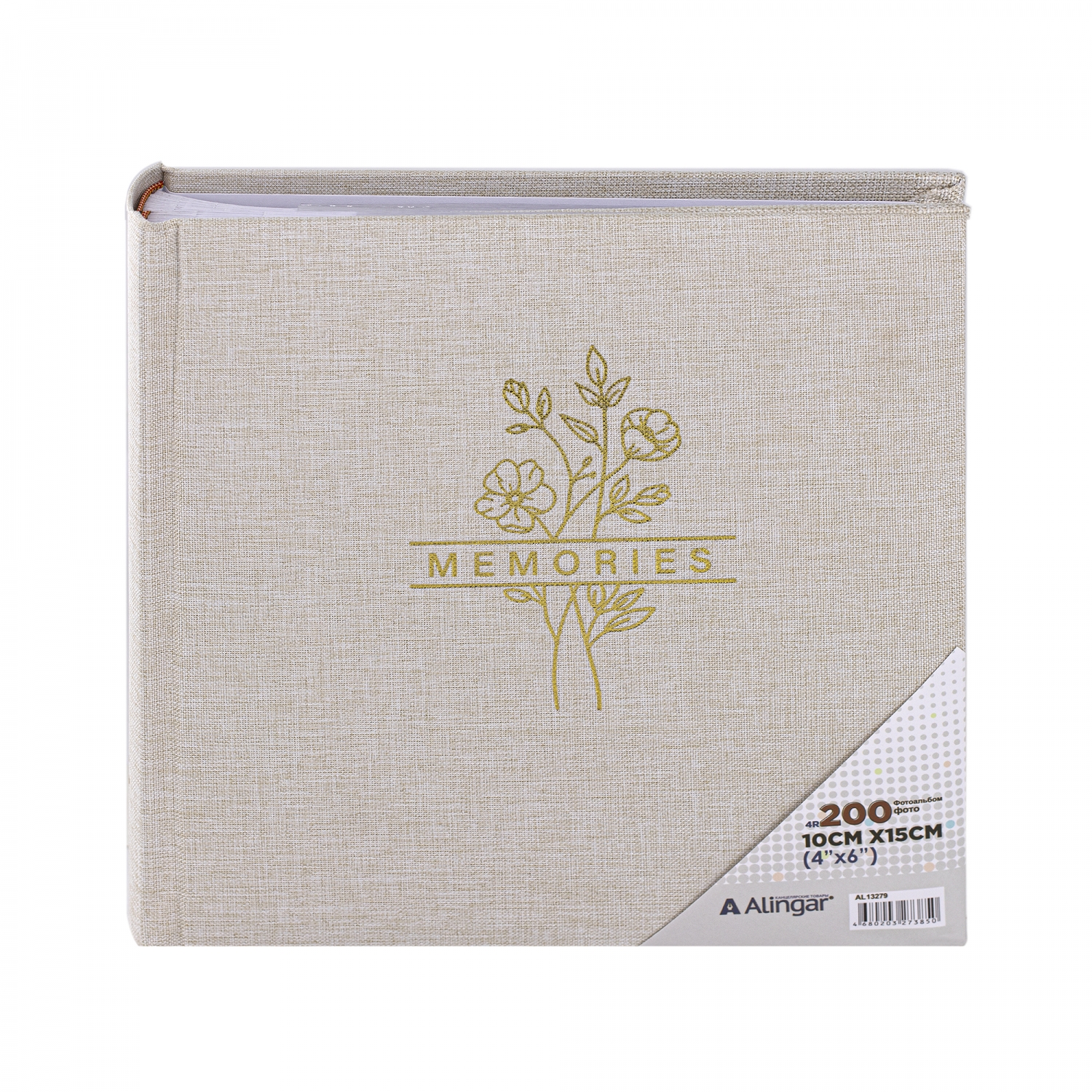 Фотоальбом, Alingar, 21,5 х 22 х 5 см, "Memories", 50 листов, бежевый, для 200 фото формата 10х15 см, текстура ткань, поля для текста, картон. коробка