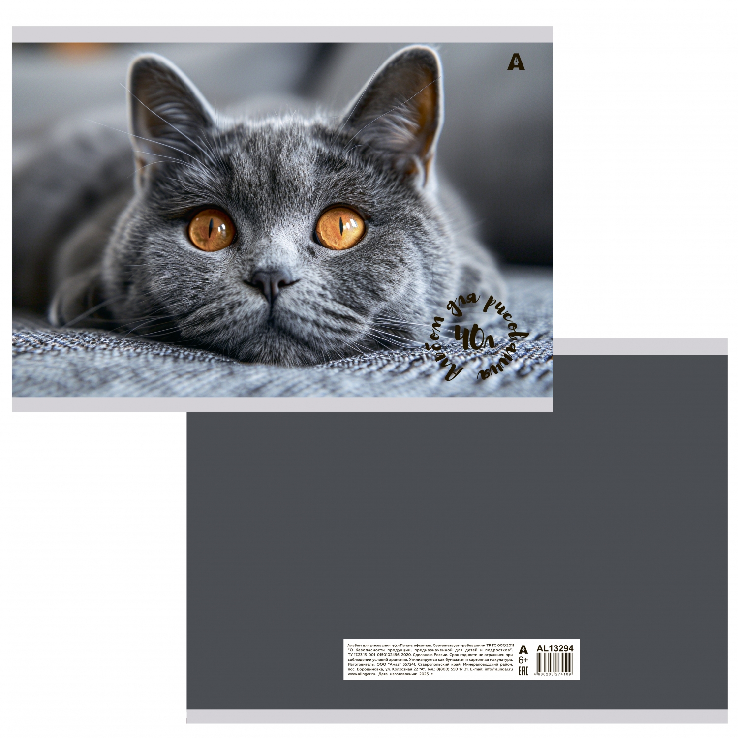 Альбом для рисования А4, 40л, Alingar, гребень, мелованный картон(стандарт) 210г/м2, офсет 100 г/м2,, "Котик", 1 дизайн в пленке т/у