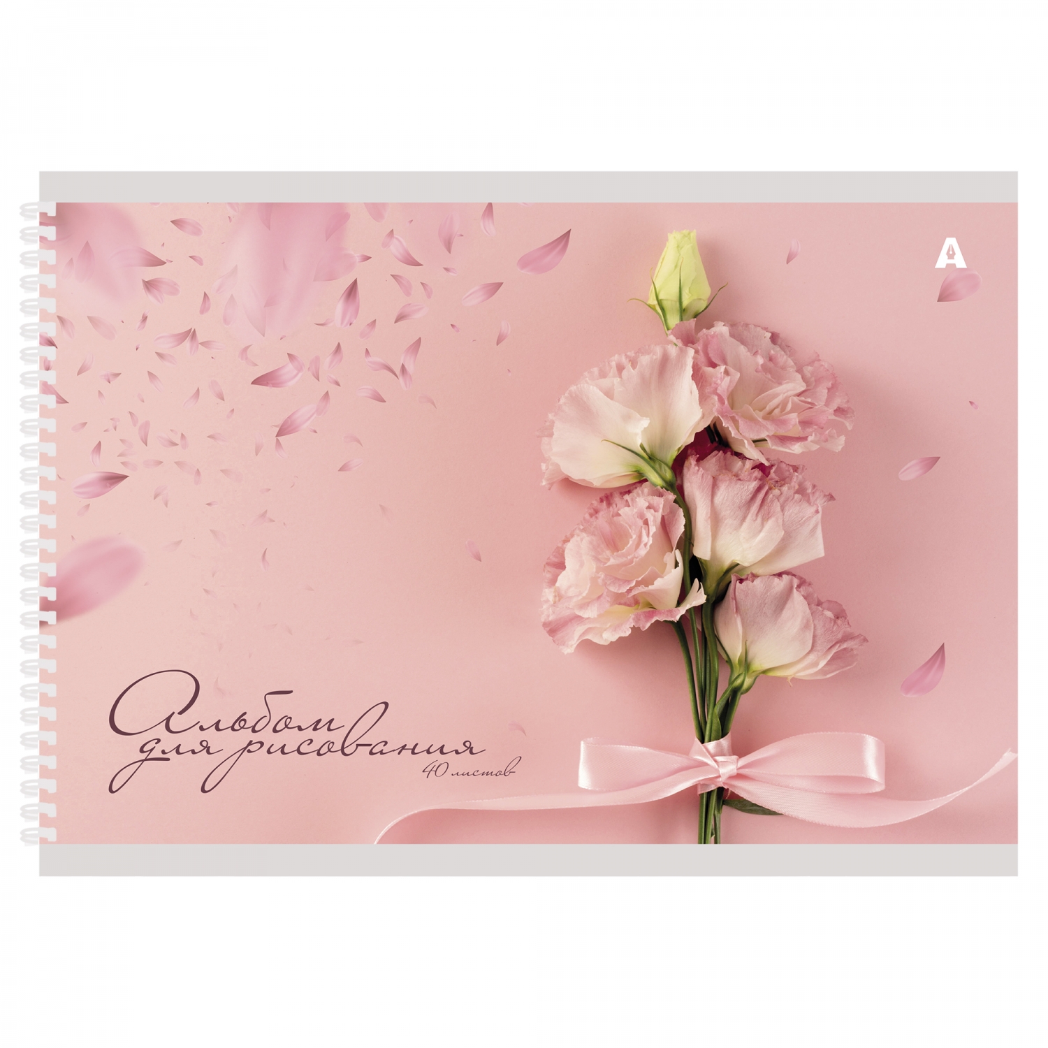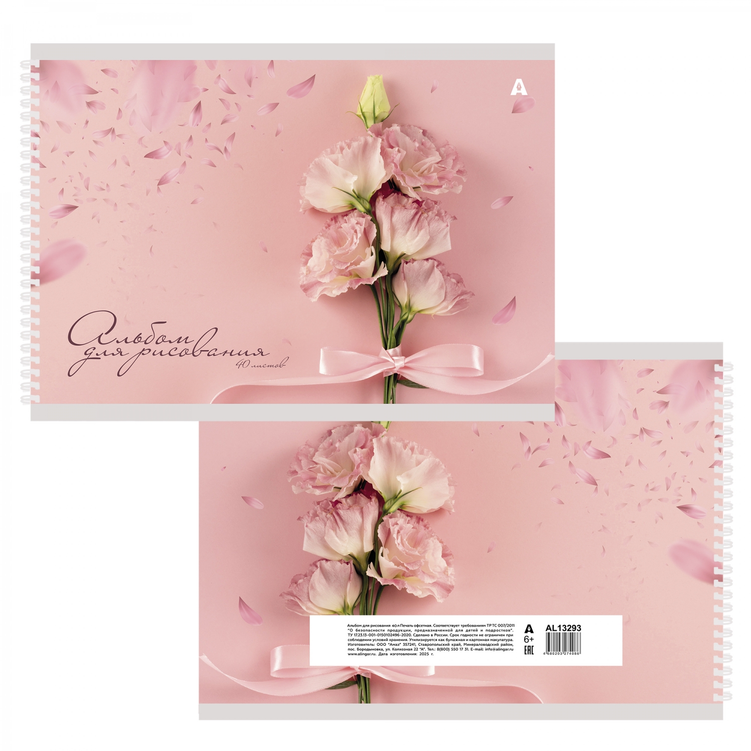 Альбом для рисования А4, 40л, Alingar, гребень, мелованный картон(стандарт) 210г/м2, офсет 100 г/м2,, "Розовый букет", 1 дизайн в пленке т/у