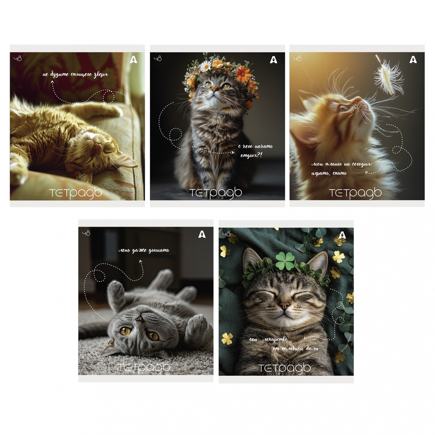 Тетрадь 48л., А5, клетка, Alingar "Кошки", скрепка, мелованый картон ( стандарт), блок офсет, 5 дизайнов в пленке т/у