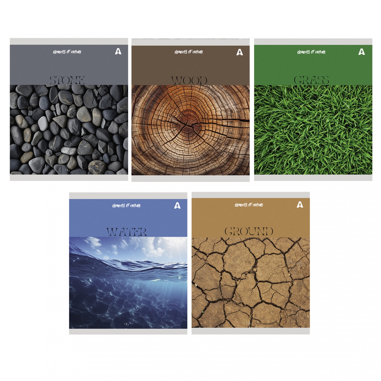 Тетрадь 96л., А5, клетка, Alingar "Elements of nature", скрепка, мелованный картон (стандарт), блок офсет, 5 дизайнов в пленке т/у