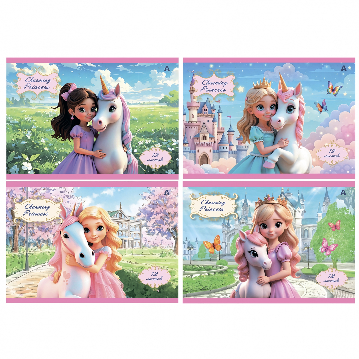 Альбом для рисования А4 12л., Alingar, на скрепке, мелованный картон (стандарт), 100 г/м2, "Принцесса с единорогом", 4 дизайна в пленке т/у
