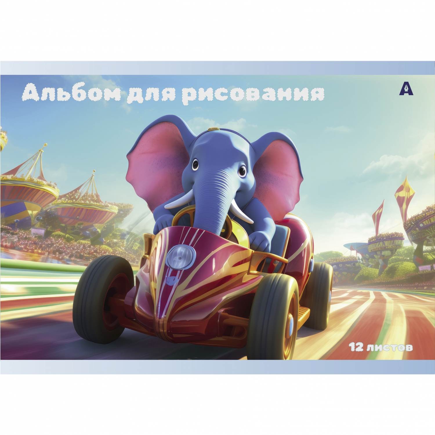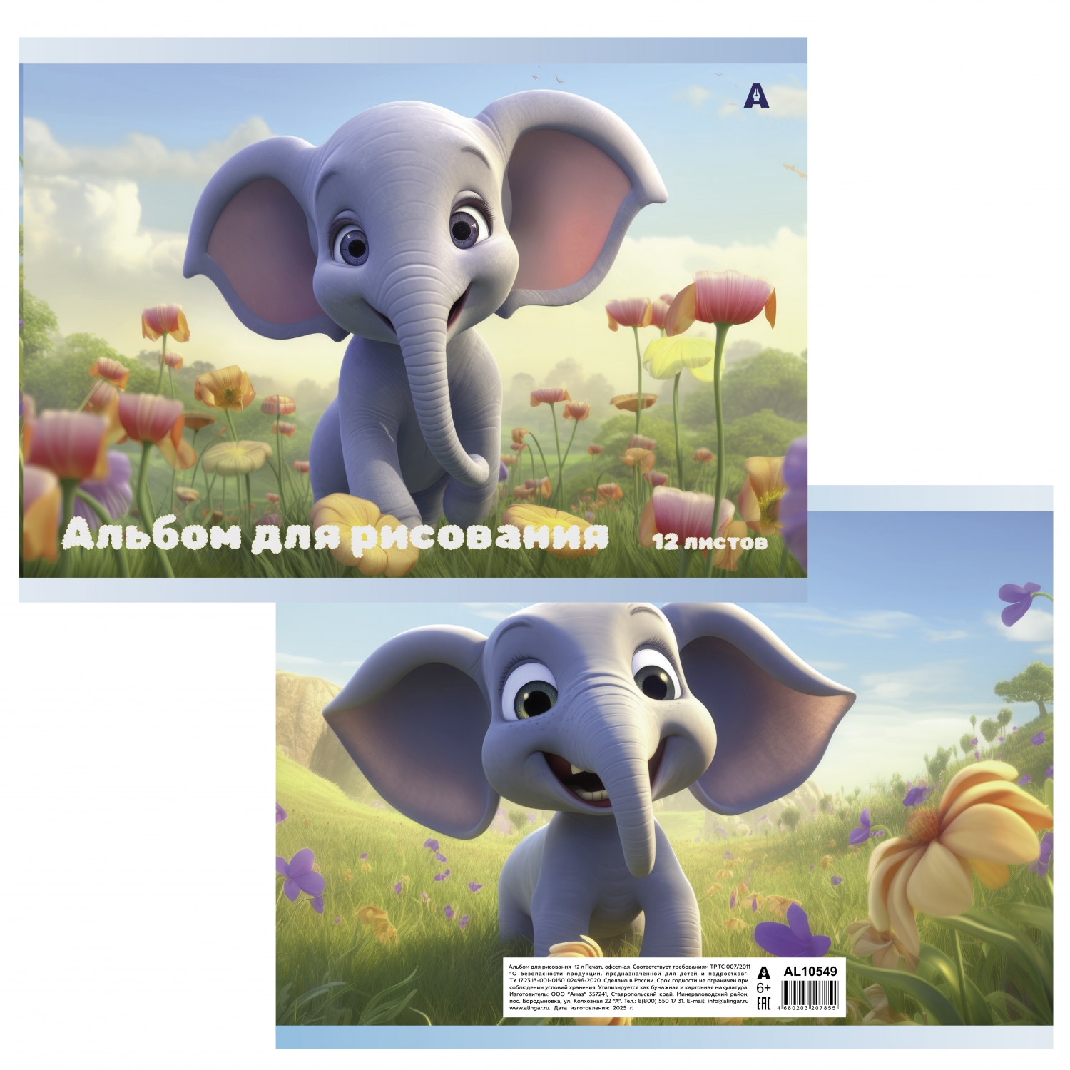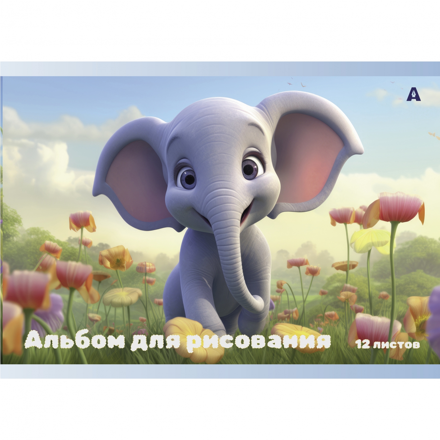 Альбом для рисования А4 12л., Alingar, на скрепке, мелованный картон (стандарт), 100 г/м2, "Слоники", 4...