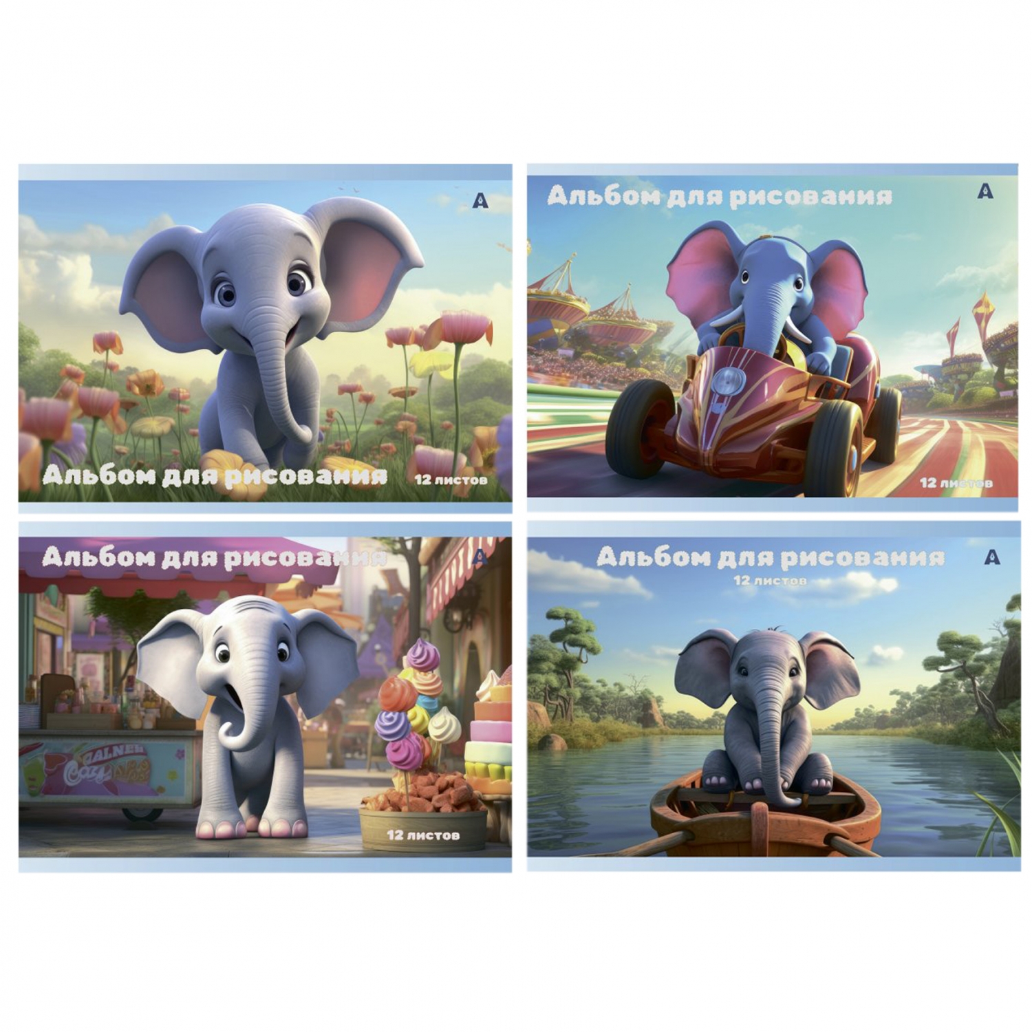 Альбом для рисования А4 12л., Alingar, на скрепке, мелованный картон (стандарт), 100 г/м2, "Слоники", 4 дизайна в пленке т/у
