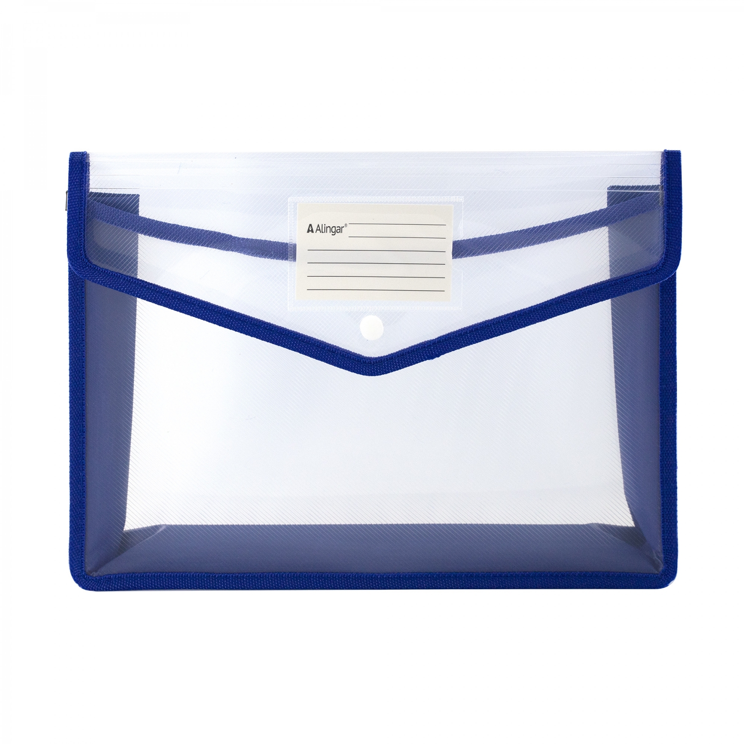 Папка-конверт на кнопке Alingar, A4, 250х330х75 мм, 450 мкм, горизонтальная, карман для визитки, синий цвет, прозрачная