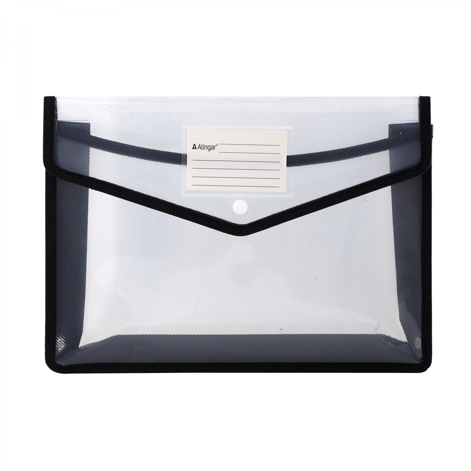 Папка-конверт на кнопке Alingar, A4, 250х330х75 мм, 450 мкм, горизонтальная, карман для визитки, черный цвет, прозрачная