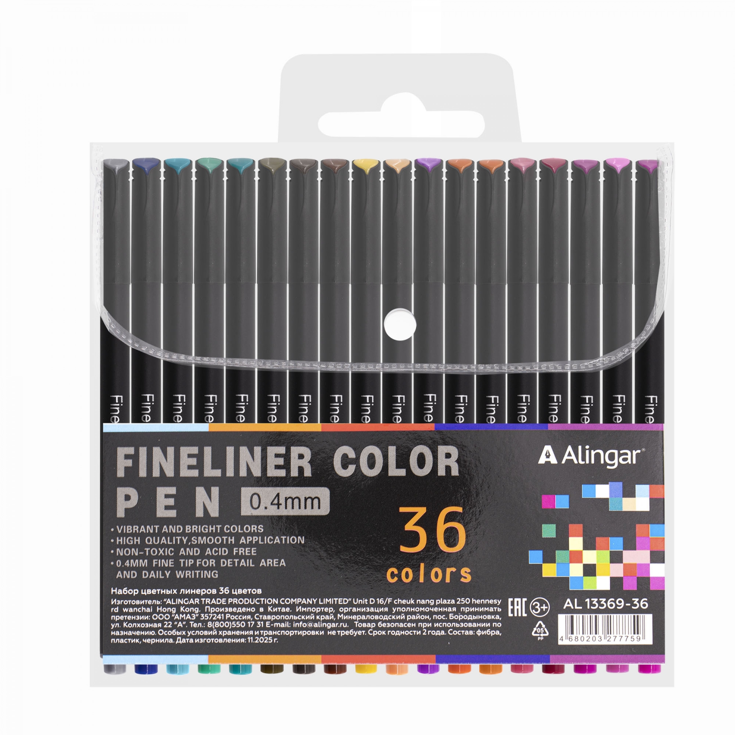 Набор разноцветных линеров Alingar, 36 цветов., 0,04 мм, черный цвет. корпус, ПВХ упаковка
