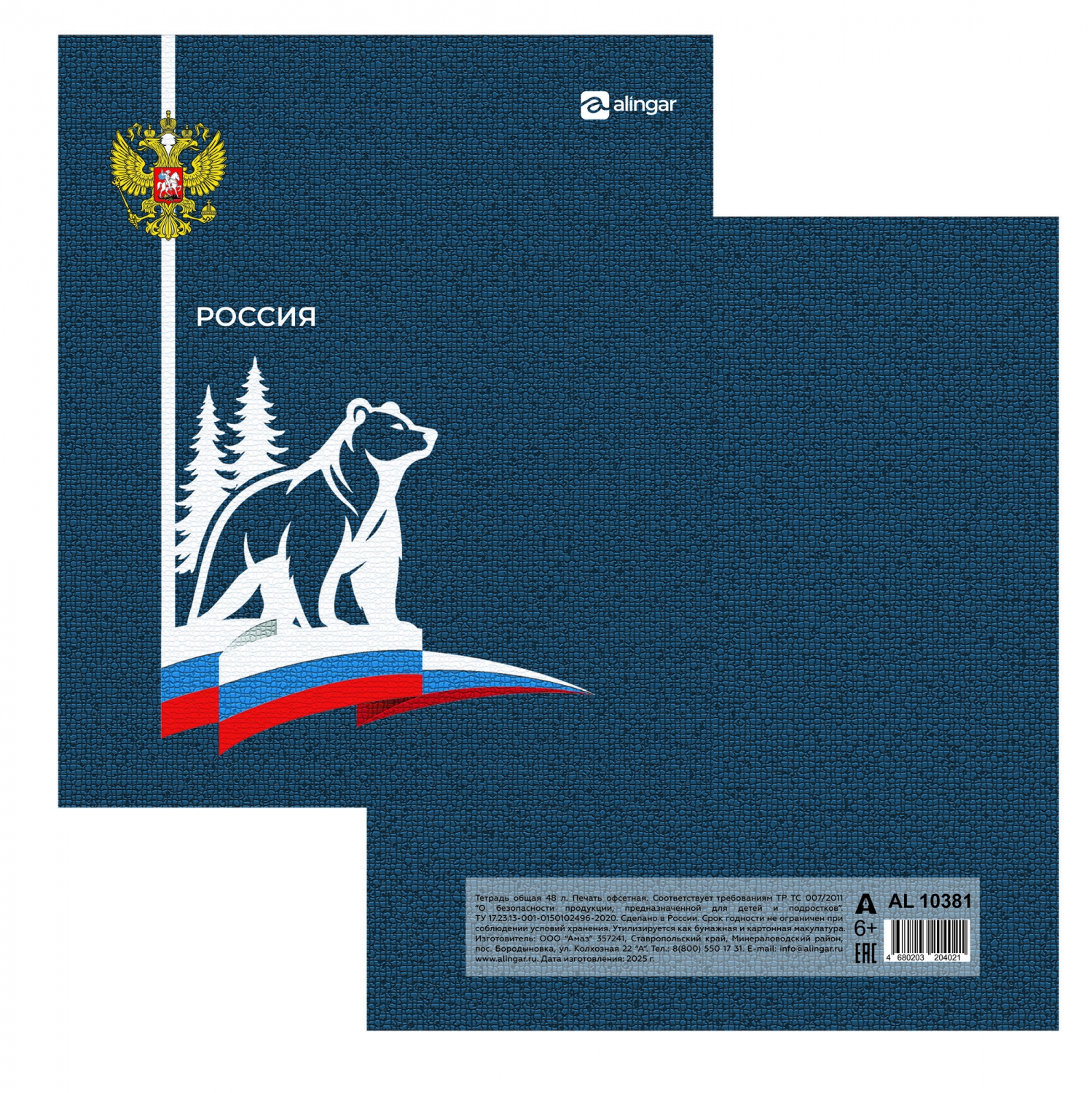 Тетрадь 48л., А5, клетка, Alingar "Россия", скрепка, мелованный картон (стандарт), блок офсет, 4 дизайна в пленке т/у