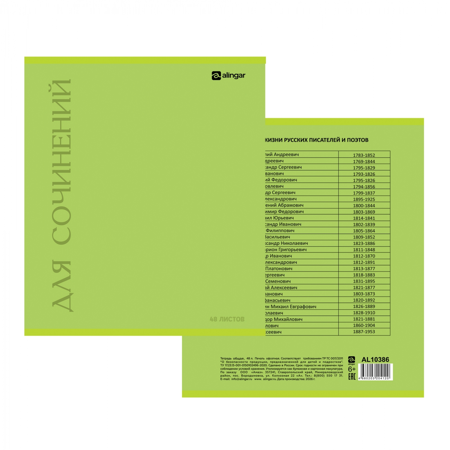 Тетрадь предметная "Для сочинений"48л., А5, линия, скрепка, мелованный картон (стандарт), блок офсет, Alingar