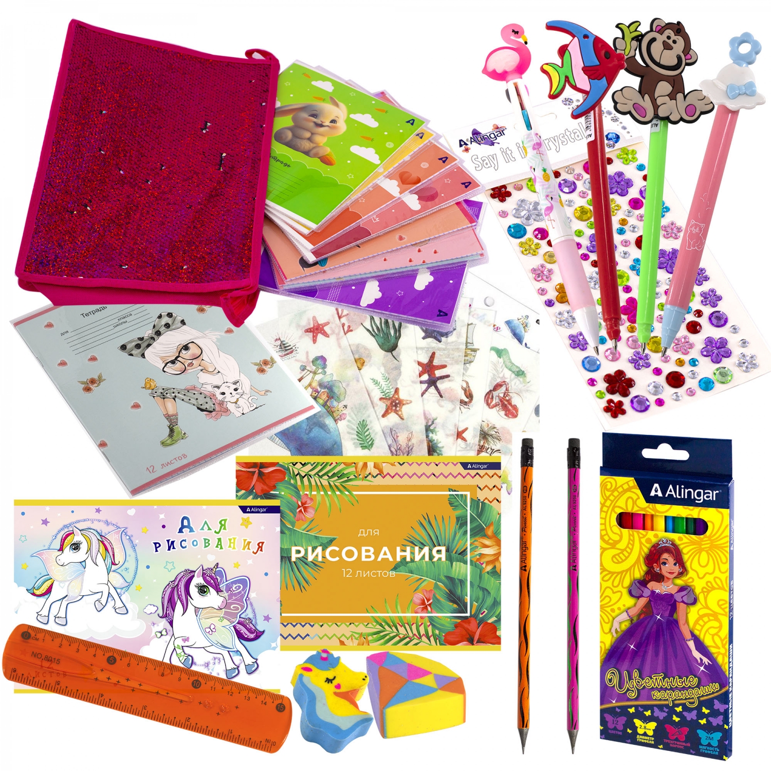 Тетрадь 12л., линия, Alingar, скрепка, блок офсет, 100% белизна, мелованный картон -5 шт.