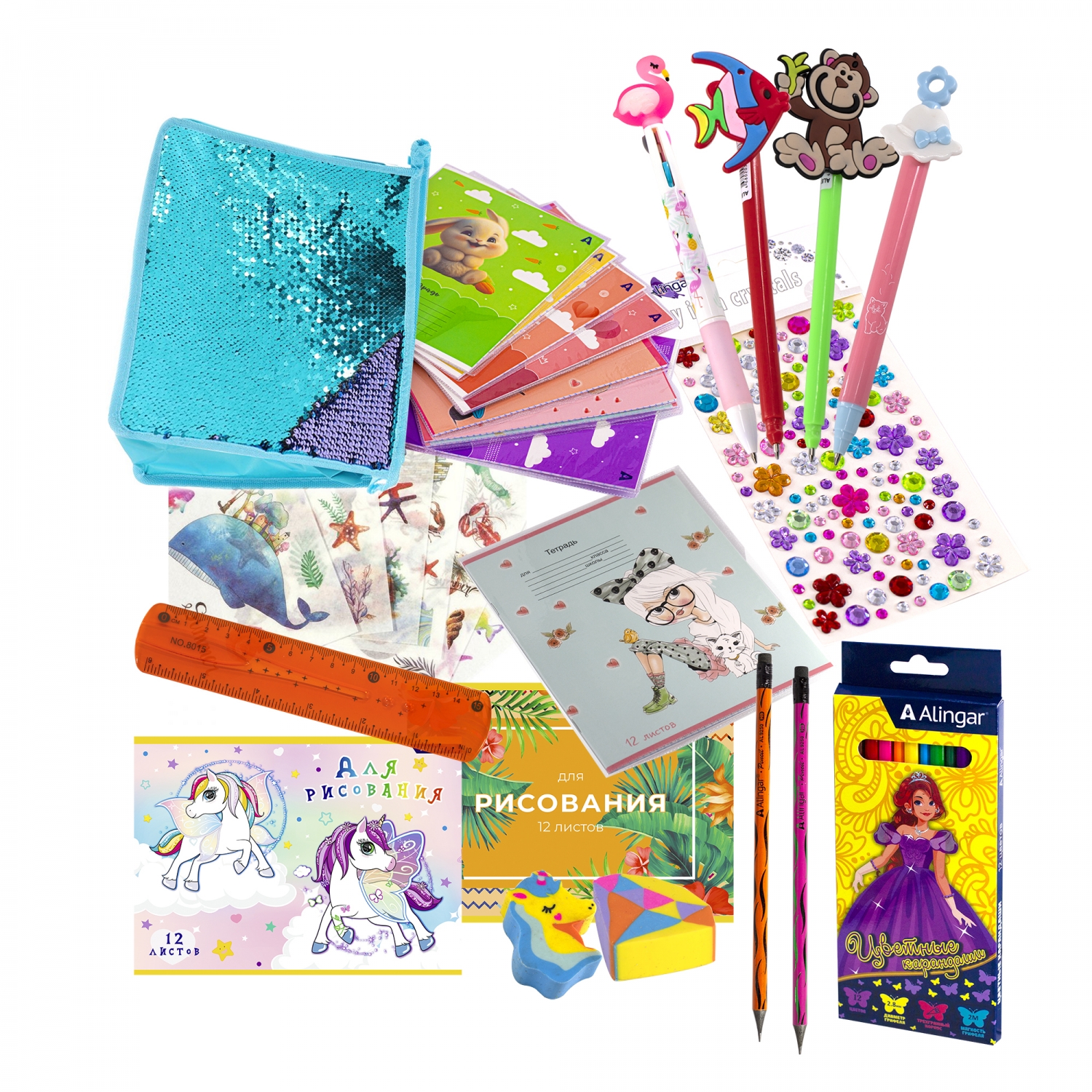 Набор школьный Alingar "Единорожка" 65 предметов, упаковка гофрокороб
