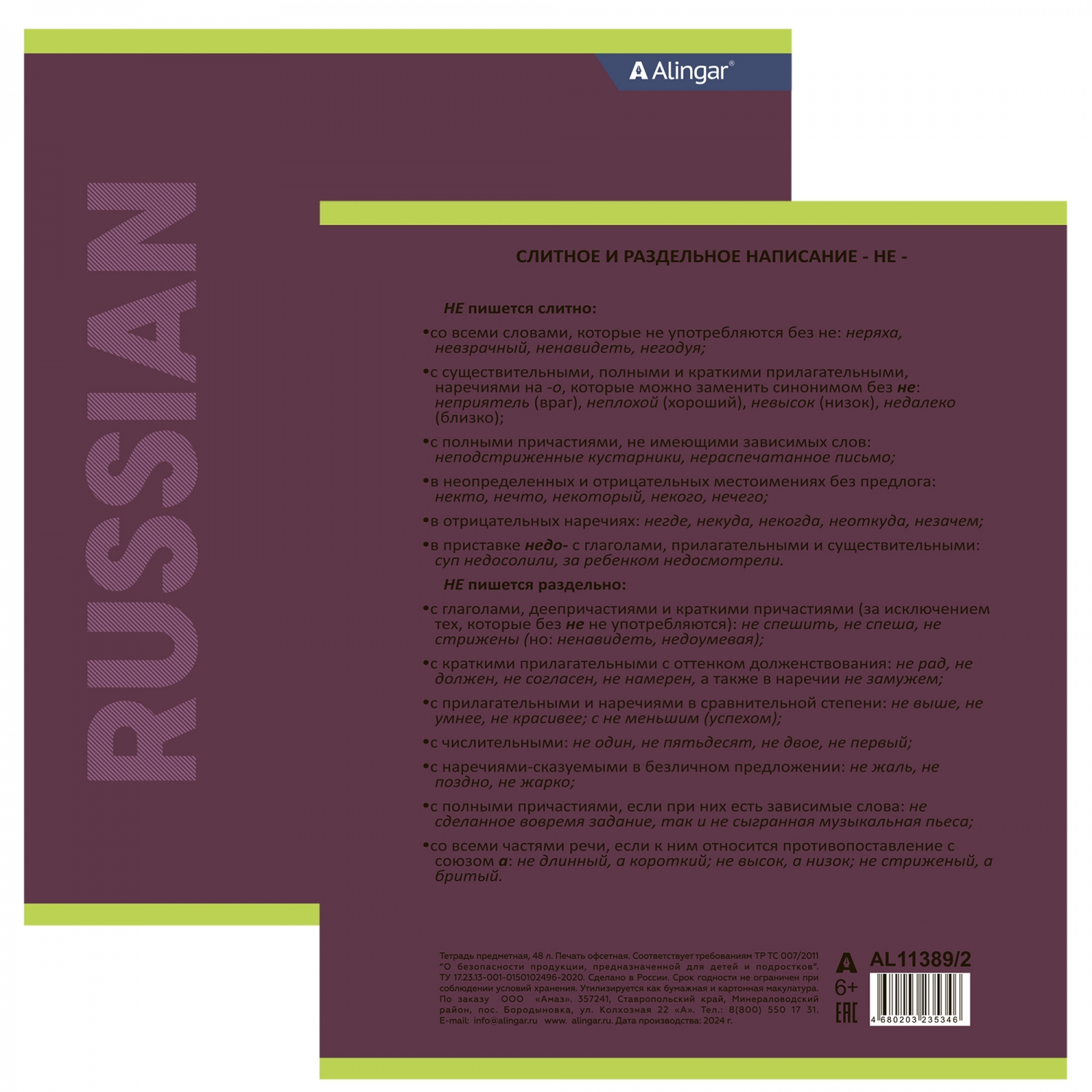 Тетрадь предметная "Русский язык" А5 48л., линия, со справочным материалом, скрепка, мелованный картон (стандарт), блок офсет, Alingar "Классика"