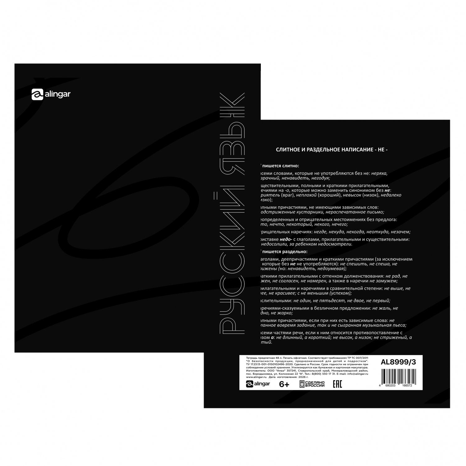 Тетрадь предметная "Русский язык" А5 48л., линия, со справ. матер, скрепка, мелованный картон (стандарт), блок офсет, Alingar "Предметы на чёрном"