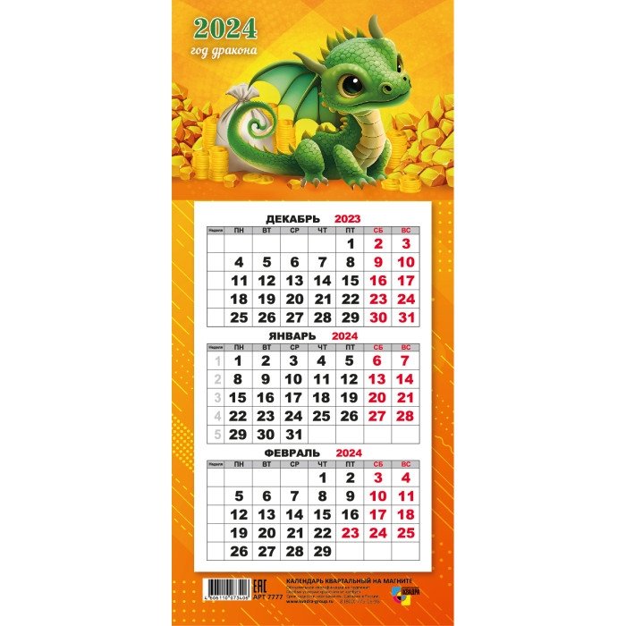 Календарь магнитный отрывной трио, Квадра 2024 "Символ года Дракон"