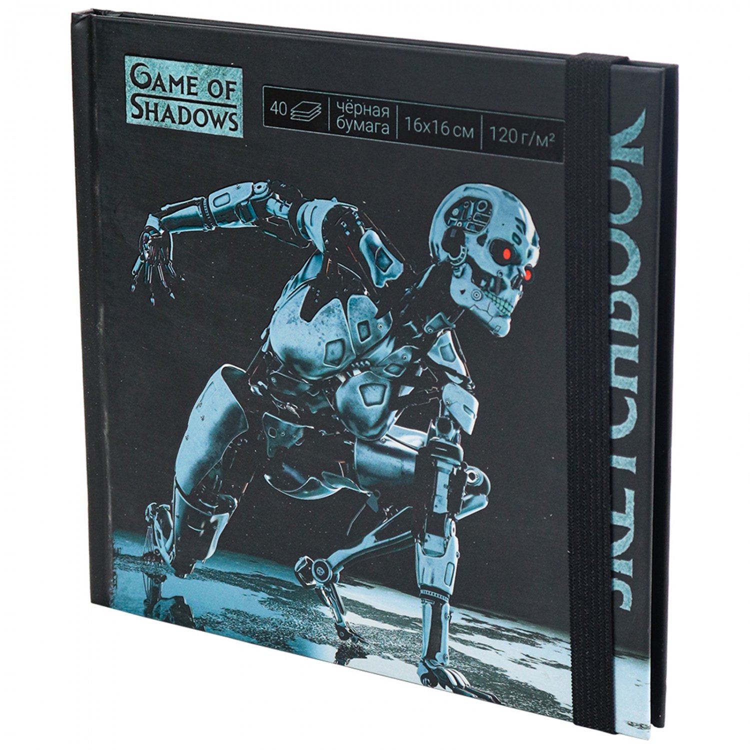 Скетчбук 160*160 мм., 40л., "Т-800", 120г/м2, Миленд, 7БЦ, матовая ламинация, выб. лак, резинка, чёрный офсет