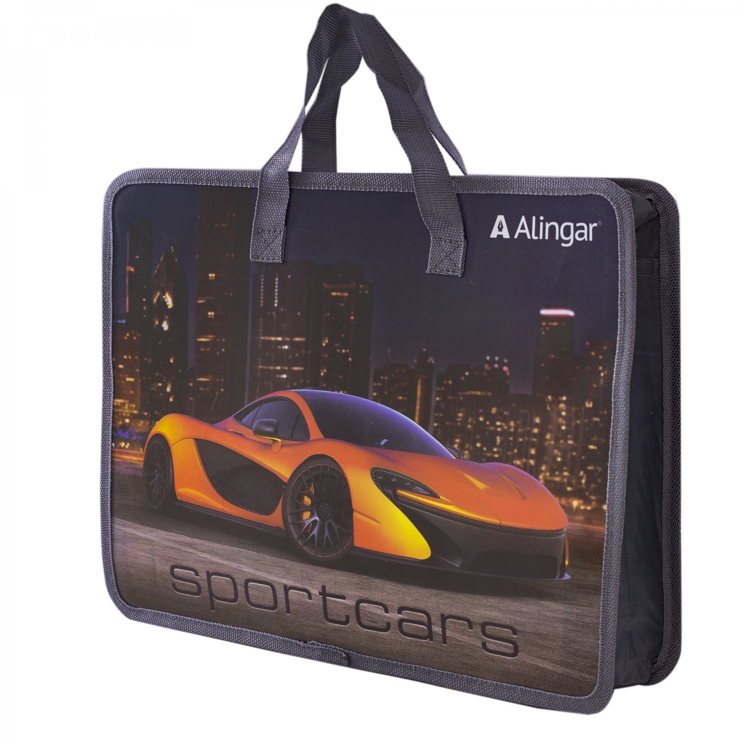 Папка с ручками 1 отделение, А4 265х335х90мм, Alingar, пластик, ручки тесьма, дизайн с двух сторон, молния сверху, "Sportcars"